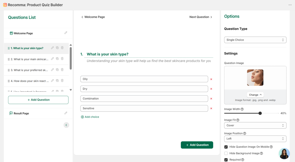 On the left side, you will find the Question List section, which allows you to easily navigate between questions, as well as configure the Welcome page and Result page.