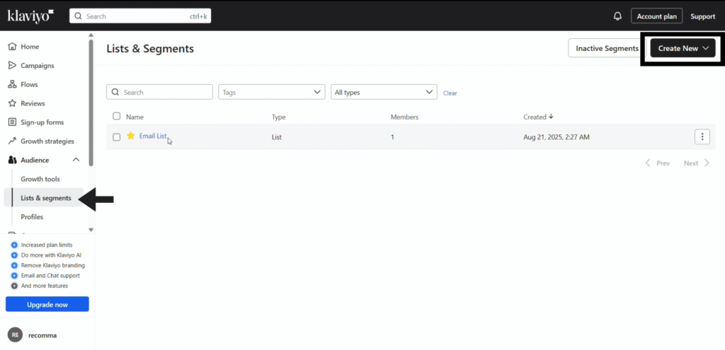 - In Klaviyo, navigate to Audience > Lists & Segments.