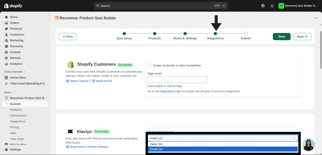 After connecting Klaviyo to Recomma make sure to choose a List from the Integrations tab in your quiz.