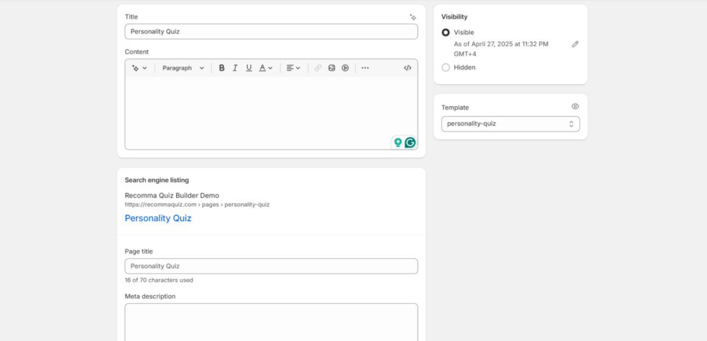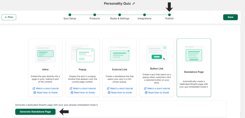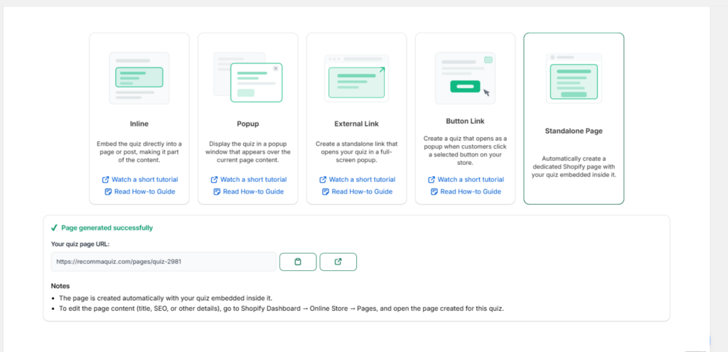 Here’s a quick guide on setting up your quiz as a standalone page. The Standalone Page publish type allows you to publish your quiz as an independent Shopify page with its own unique URL. Here’s how to set it up.